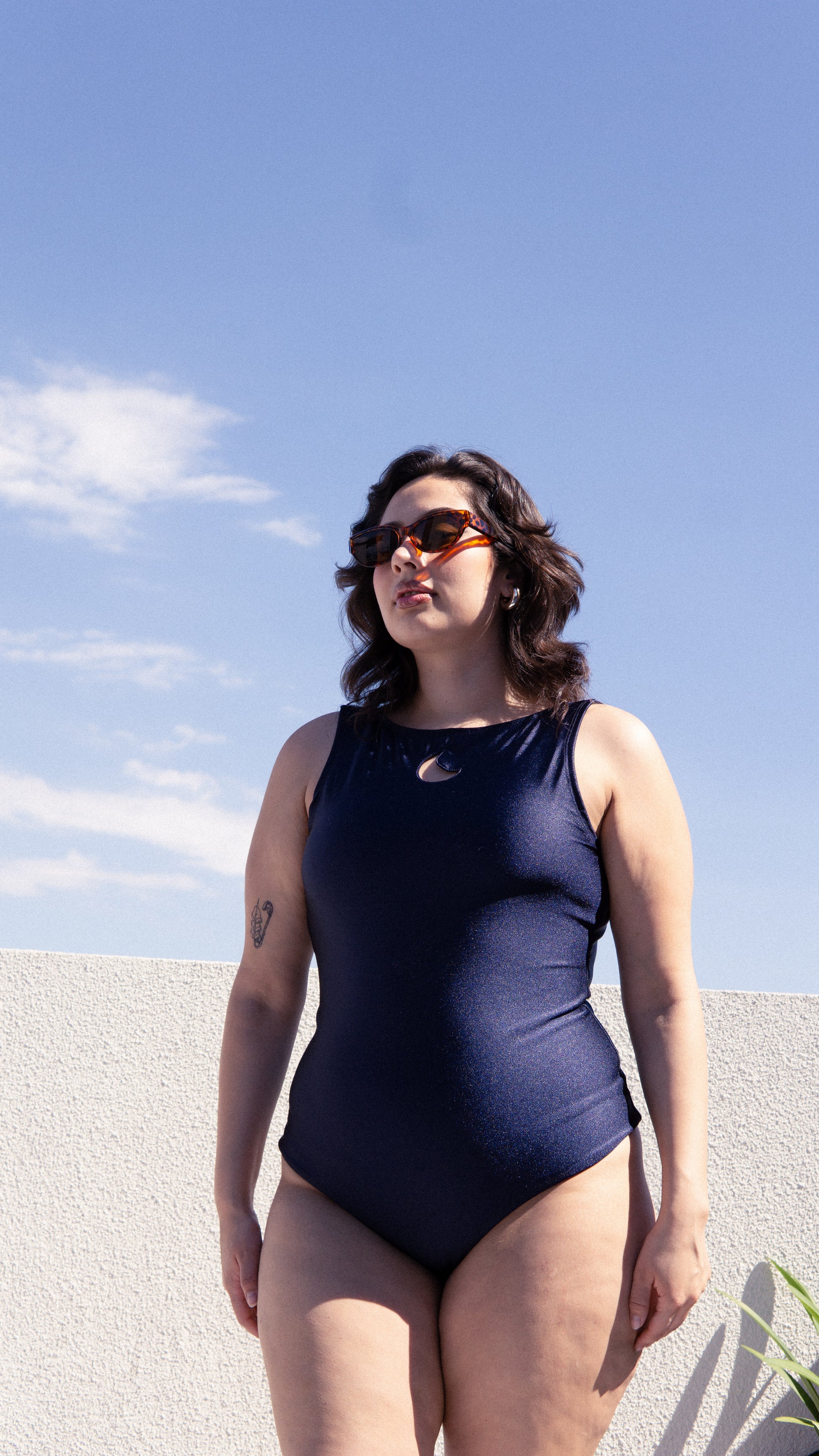Traje de baño entero de lycra dupont en azul marino profundo con un leve satinado. La espalda es rebajada con costuras elásticadas y va completamente forrado en lycra fría.