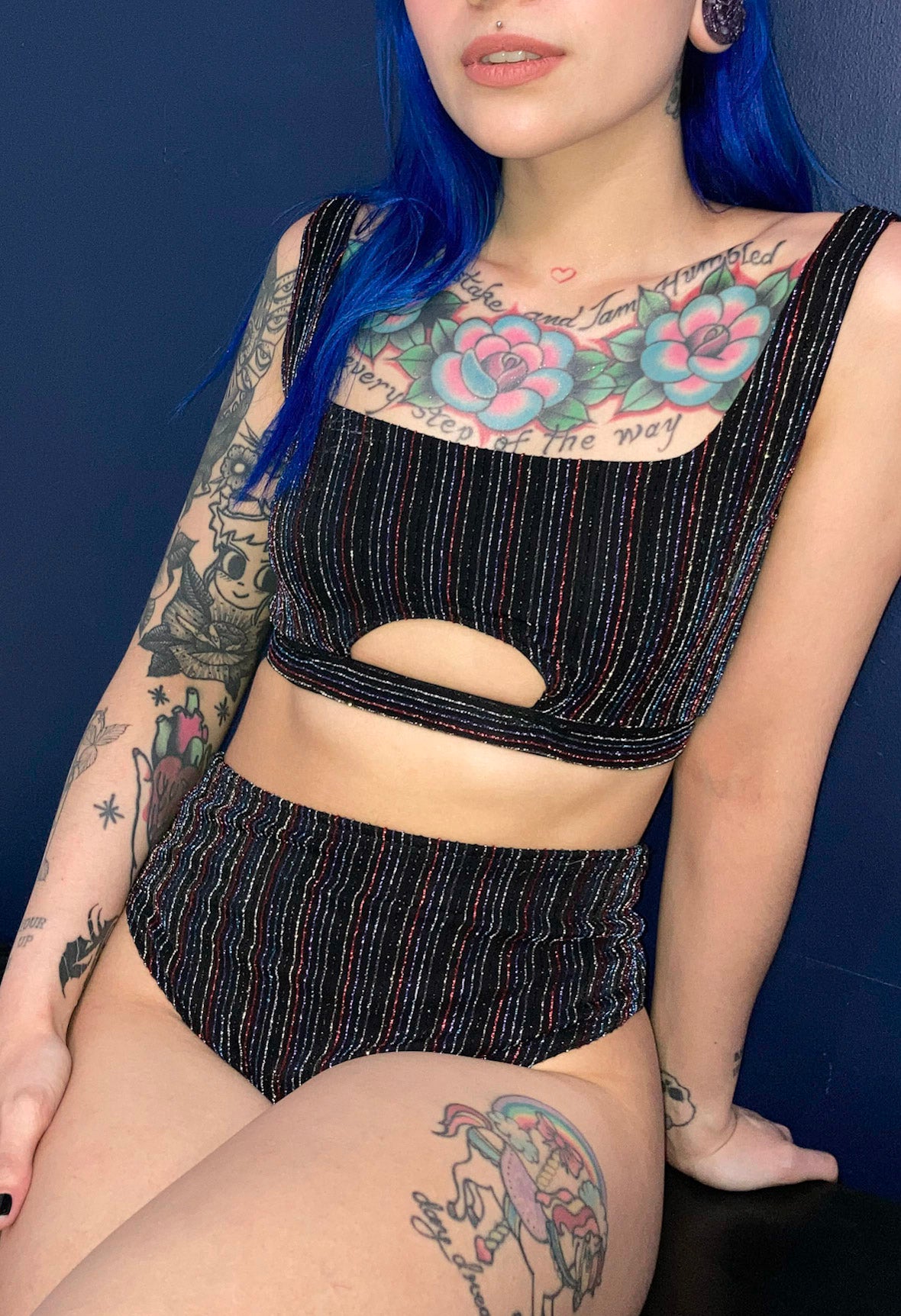 Bañador de dos piezas, top estilo deportivo con abertura bajo el busto y bikini.