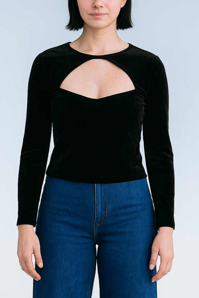 Top de terciopelo negro elastizado con escote en forma de triangulo invertido . Es muy versatil y combinable |